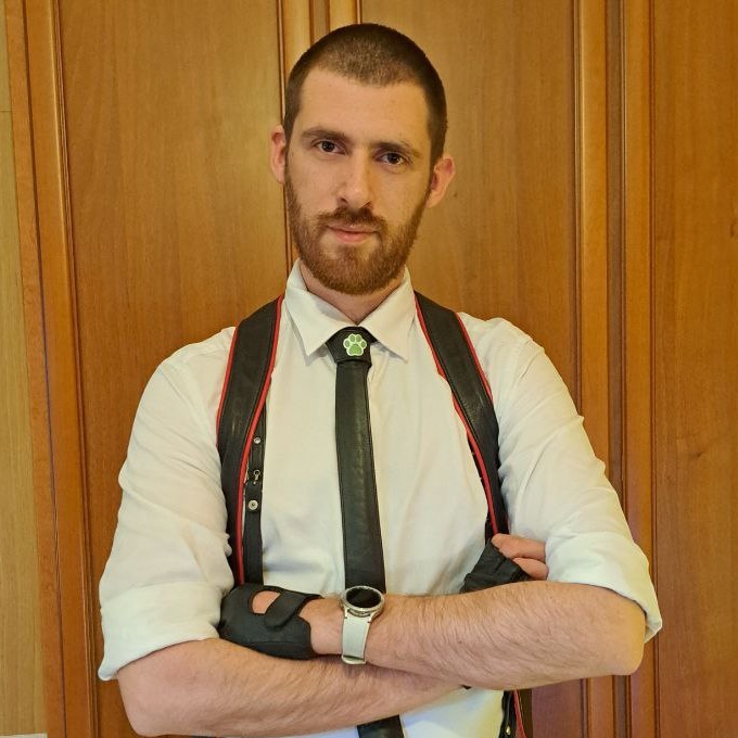 Hi, I'm Mad, 27 years old from Vicenza. Since university, I have been involved in activism and the LGBTQIA+ world, particularly in associations and cultural activities. Over the last two years, I decided to explore this community and the realities that comprise it, not only in search of inspiration, but also to find a place where I could feel at home. I found much more than that. Leather, puppy, biker, military, and lycra: for me, these are not just fetishes or kinks. They're culture, emotions, and bonds; elements that, event after event, friend after friend, have created the Mad I am today. I've decided to take on this new challenge by pursuing themes such as intergenerationality and collaboration in events between north and south, the expansion of cultural offerings, the promotion of biker culture and bootblacking, inclusion, and active activism.